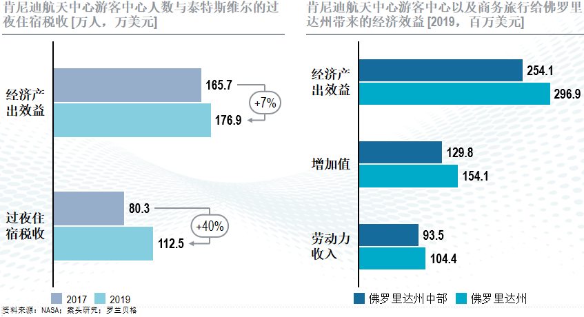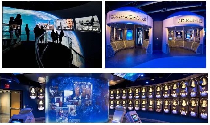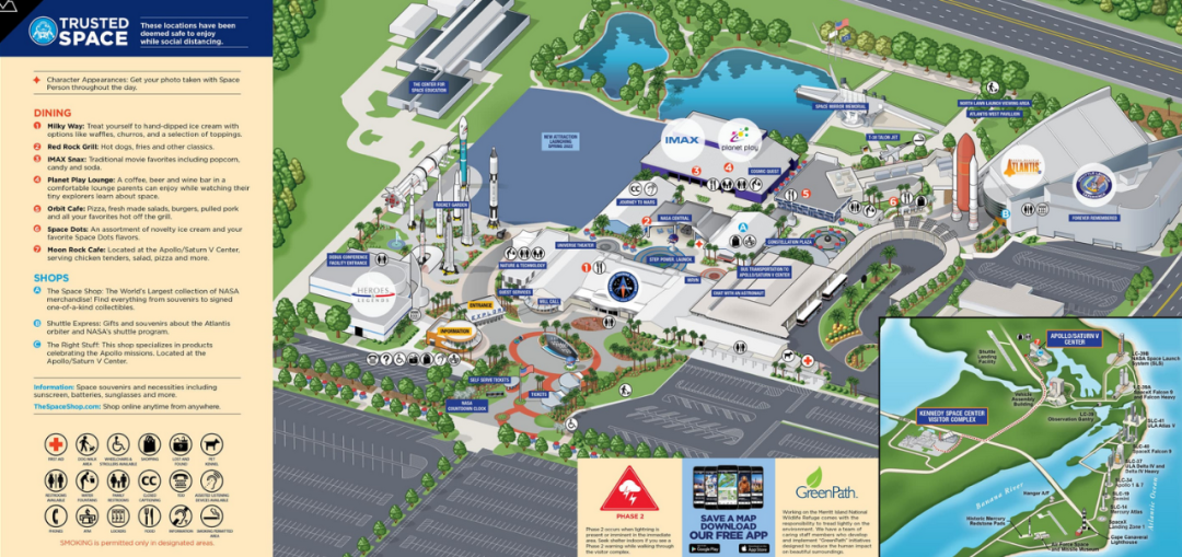 游客中心内景点与航天主题密切相关,提供系列的体验活动。火箭公园(Rocket Garden)是历史上拍摄最多的景点之一,塑造了游客中心的天际线,公园内的火箭多数都是真正的原型设备。在其设置的宇航员见面活动(Astronaut Encounter)中游客可与一位资深NASA宇航员见面,曾在太空生活和工作过的指挥官、飞行员、任务和有效载荷专家在现场演示和问答环节中分享他们的经验。美国宇航员名人堂(U.S. Astronaut Hall of Fame) 作为纪念美国宇航员的地方,游客可以通过引人注目的展示了解太空英雄的生活。亚特兰蒂斯号航天飞机(Space Shuttle Atlantis)是美国展示的三架航天飞机之一,它展示了真实的轨道飞行器部分并讲述了美国宇航局30年航天飞机计划的精彩故事。哈勃望远镜剧院(Hubble Space Telescope Theater) 则拥有一个精确的望远镜复制品悬挂在亚特兰蒂斯号航天飞机的两层楼之间,剧院还允许近距离观察哈勃和它的太阳能电池板阵列的配置。