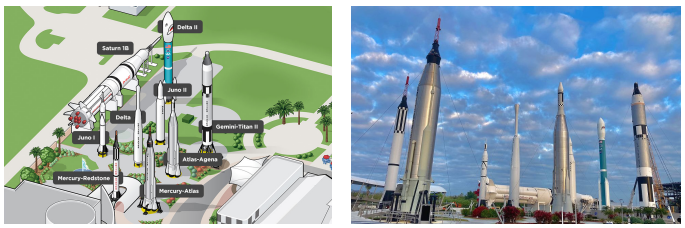 除了游客中心,游客还可以通过巴士参观路线(Kennedy Space Center Bus Tour)进入到肯尼迪航天中心参观最关键的任务区域如发射中心和飞行器组装大楼。巴士参观目的地为阿波罗/土星5号中心(Apollo/Saturn V Centre),这里展览了真正的有史以来在太空中飞行的最大火箭即土星五号火箭,火箭旁边展示了其40多万人的组装人员团队的一些震撼的工作场景。