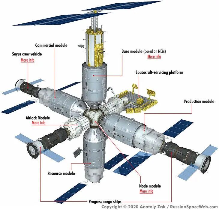 2030年前后将发射2个与NEM模块类似设计的加压实验舱,舱段推进模块较NEM舱段有所变化;此外还增加一个非加压的实验模块;对接飞船也从联盟/进步飞船换成新一代的雄鹰号飞船。