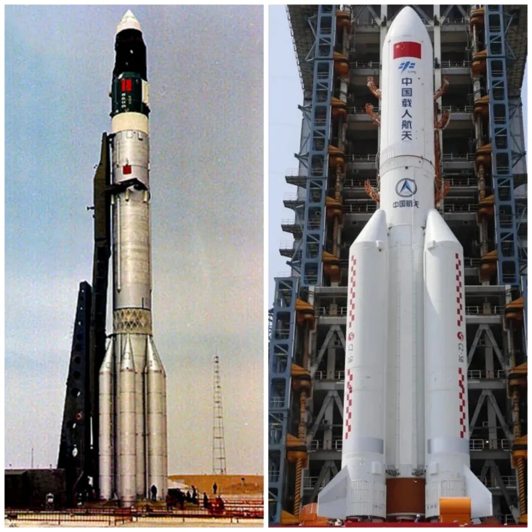 左侧为发射前抵达工位的质子K火箭,准备发射礼炮-1号空间站;右侧为发射前抵达工位的长征五号B遥二运载火箭,准备发射天和号空间站核心舱