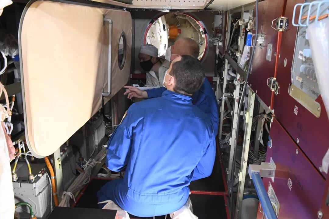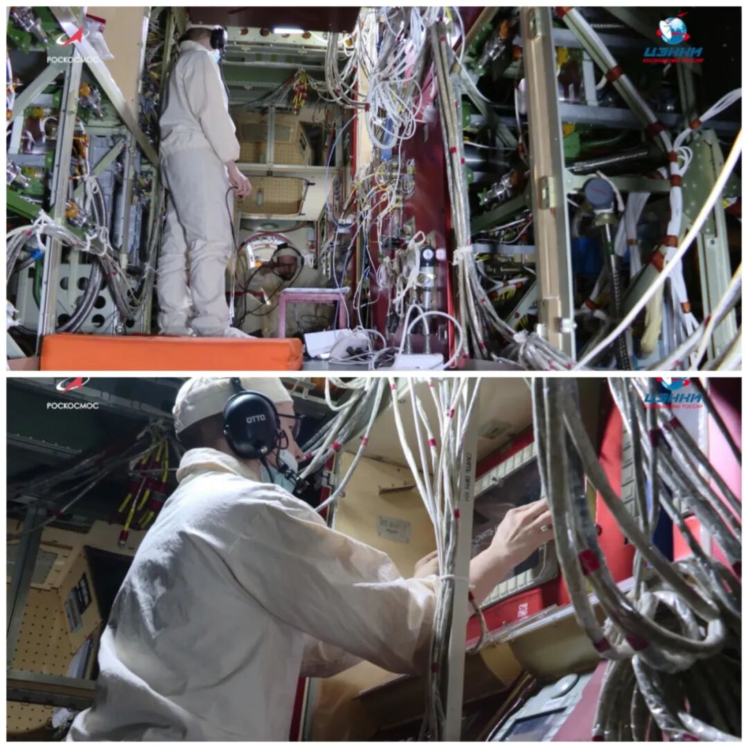 联盟MS-18飞船俄方航天员在”科学号“实验舱内考察