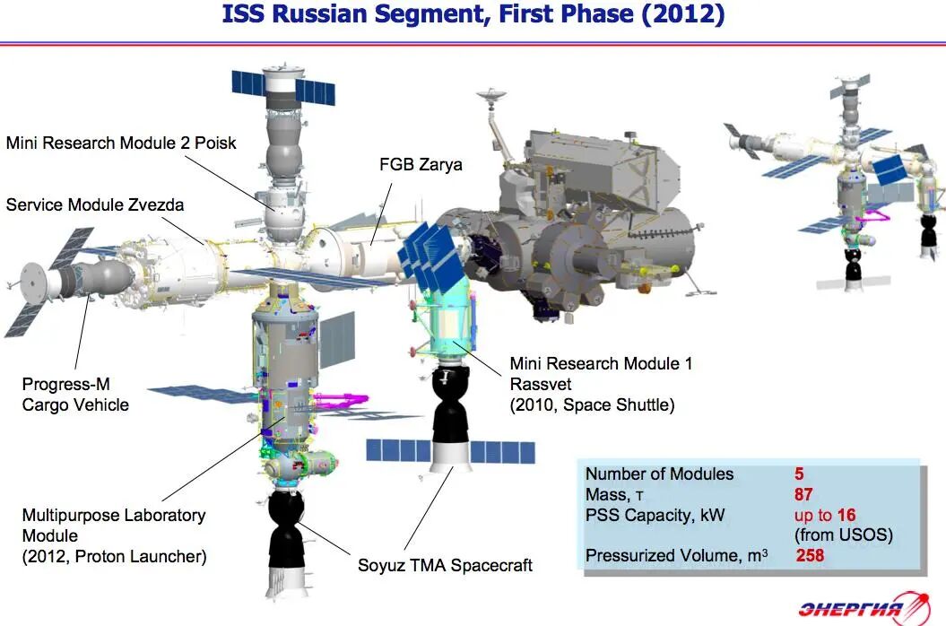 目前,国际空间站上共有5个俄罗斯舱段,分别是曙光号多功能舱、星辰号服务舱、码头号对接舱,以及“探索号(码头2号)”和“黎明号”两个小型研究模块。