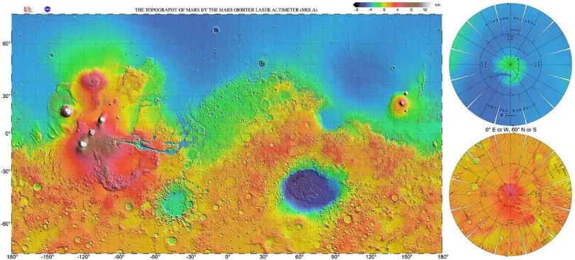 火星全球勘探者号获取的火星地形图,越红越高,越蓝越低。来源:NASA/MOLA [11]