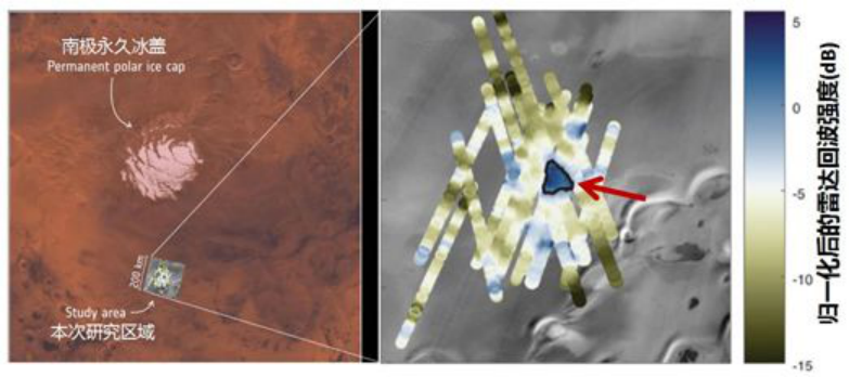 疑似冰下湖的位置(对应着高反射强度,图中蓝色区域)。来源:ESA和参考文献 [20]