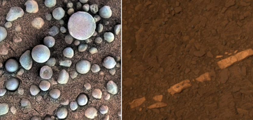 机遇号发现的“蓝莓”(赤铁矿结核)和石膏脉(水合硫酸钙矿物),均是火星曾有过温暖湿润环境的证据。来源:NASA/JPL