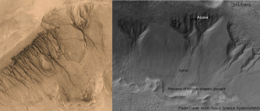 火星全球勘探者号MOC相机拍摄的火星表面的冲沟。来源:NASA/MOC