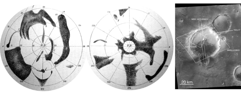 尔在1840年发布的首张火星全球地图;(右)直径约500米的艾利-0撞击坑,位于直径40千米的艾利撞击坑内部。来源:MGS MOC [3]