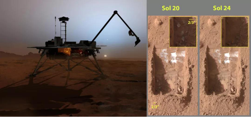 (左)凤凰号工作假想图;(右)凤凰号挖出的水冰,注意左下角新挖出的水冰4个火星日后挥发消失了。来源:NASA/JPL