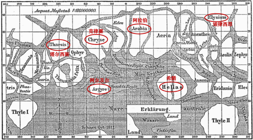 乔凡尼·斯基亚帕雷利绘制的火星全球地图和地图中沿用至今的火星地名(红圈),此图相比于原图做了经度显示范围的调整,注意纬度显示是不均匀的,而且范围只在北纬50°-南纬80°之间。修改自:斯基亚帕雷利1877火星地图