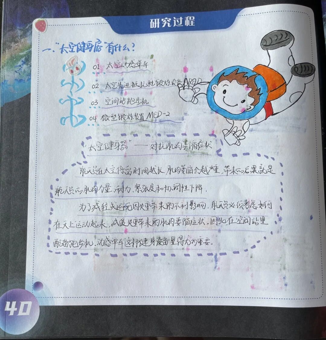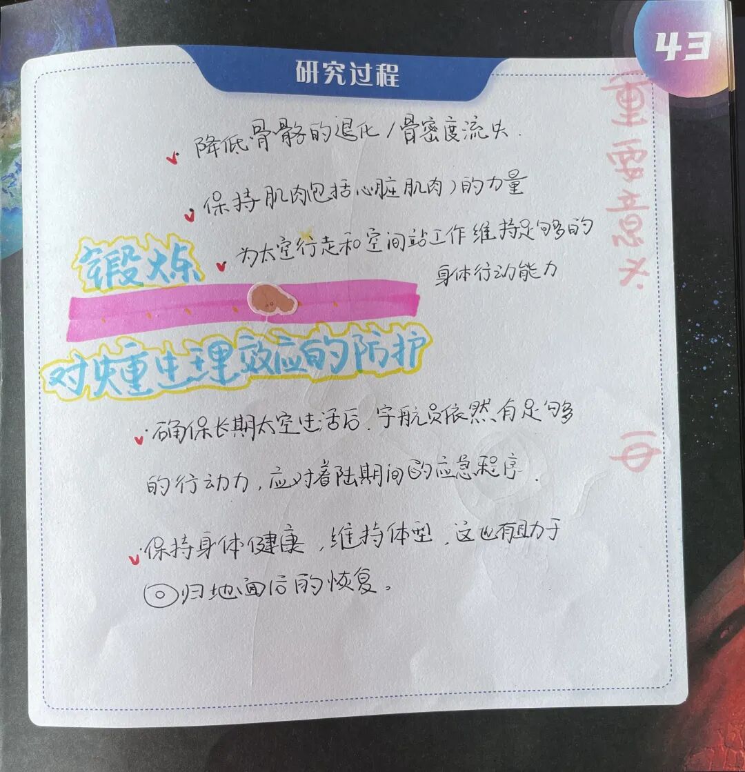 每位航天员每天需锻炼约两个小时,以防止心血管功能失调、骨质脱钙、肌肉萎缩等“太空病”。我们新时代少年应在日常学习生活中,通过科学健身强壮自己的身体。遵循健身的规律,锻炼后做放松练习,
