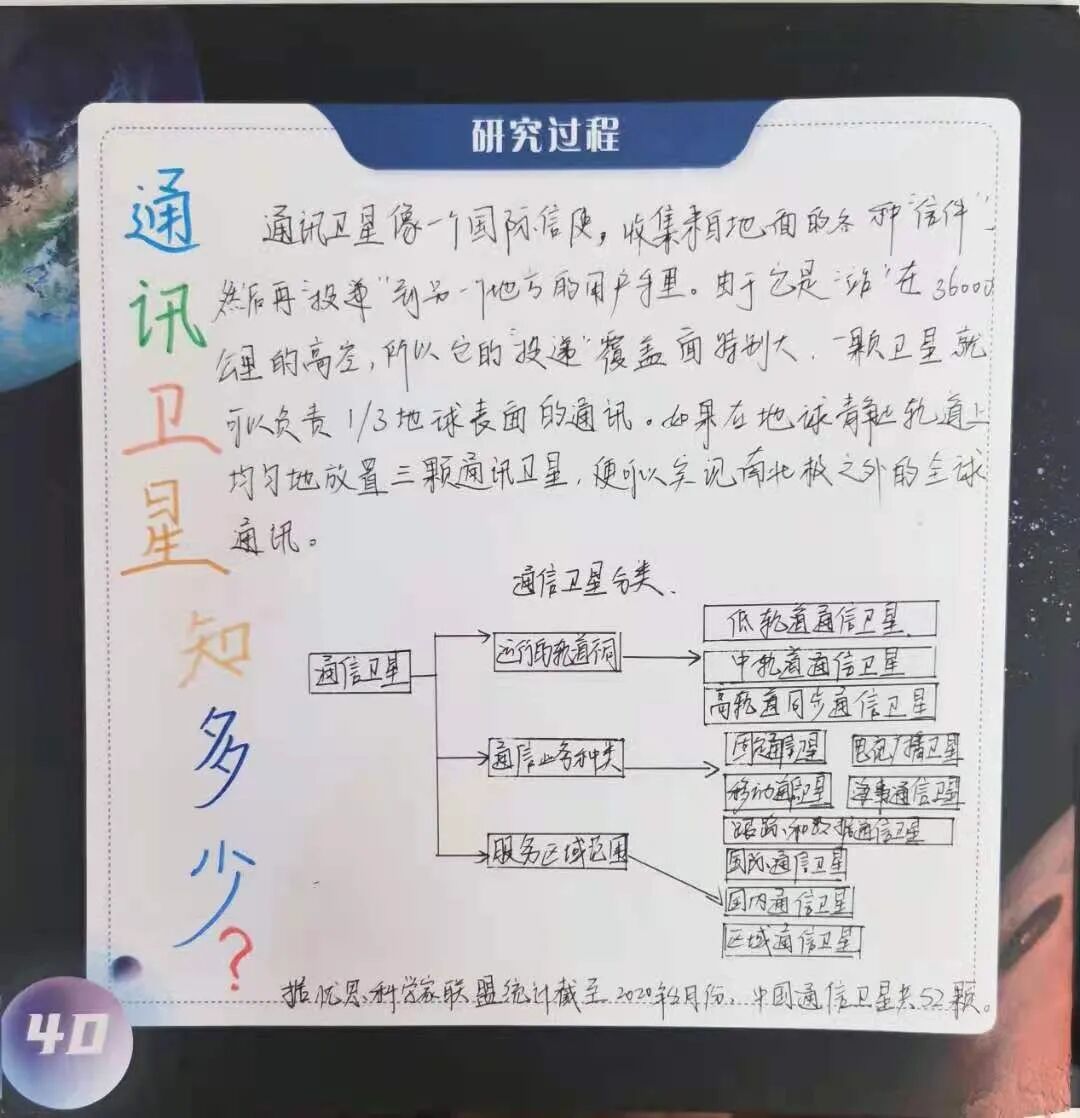 回顾研究历程,这些通讯卫星研究的素材无疑都会成为我开学第一课的素材,科学课堂上,我和孩子们一起徜徉星辰大海,漫谈太空趣事,是多么令人羡慕的一幕。等到那一天,我坚信,力学小米粒们一定会和我一样震惊于祖国的科技进步,坚定于祖国通讯卫星发展会越走越远。等到那一天,作为一名科学教师的我,将 一颗颗埋在儿童的心中航天种子,浇点水,施点肥,致力航天种子能发芽开花,期待小米粒们将来能为航天事业做出自己的贡献。