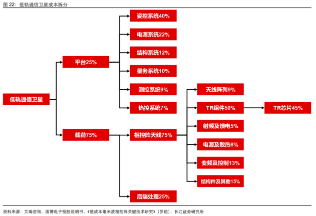 随着我国低轨卫星建设逐步开始,卫星制造作为上游产业链将率先受益。其中,批量卫星建设成本节约主要在卫星平台侧,所以,卫星载荷部分可看性更强,T/R组件是低轨通信卫星载荷的关键必备零部件,价值占比高,受益的确定性会更高一些。