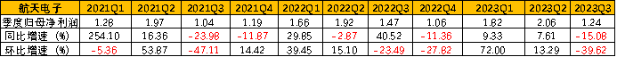 航天电子——2023前三季度,实现收入129.59亿元,同比增长+5.46%;归母净利润5.13亿元,同比增长+1.59%。