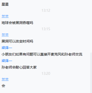首先孙老师为我们介绍了黑洞(black hole)的基础小知识。原来在18世纪末就从光速有限的认识与牛顿的逃逸速度概念结合发现引力最富有魅力的结果:黑洞。孙老师运用视频和图片直接展示黑洞的基本性质,并解答小朋友们提出的疑问。地球会被黑洞吞噬吗?黑洞可以改变时间吗?黑洞会变大吗?......孙老师通过自身在上海天文馆的体验,形象的告诉大家人被吸入黑洞会是什么样的情况。孙老师从理论学方面为我们讲解黑洞,接下来的三位小老师从不同方面也为小朋友们讲解黑洞小知识。