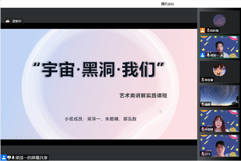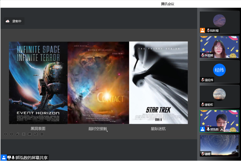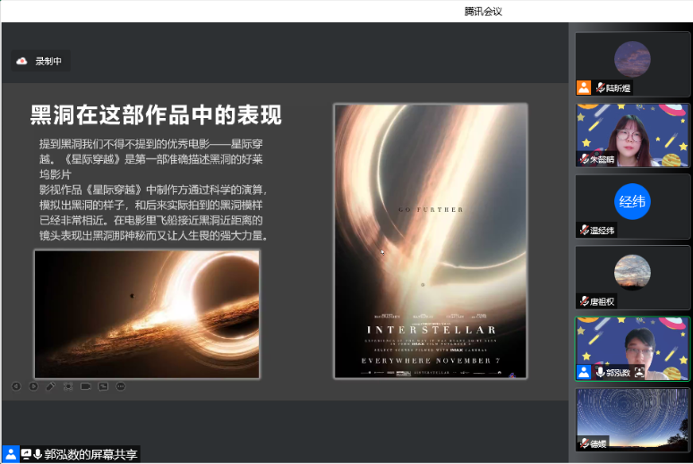 郭泓数同学从影视方面为大家介绍黑洞,以《星际穿越》为例给大家播放了有关黑洞的片段后告诉大家,在电影中也有人们对于黑洞内部空间的遐想。电影中黑洞的创作邀请到诺贝尔物理学奖得主基普索恩通过理论演练打造,运用科学的方式模拟进入黑洞,给我们带来非常震撼的观感。