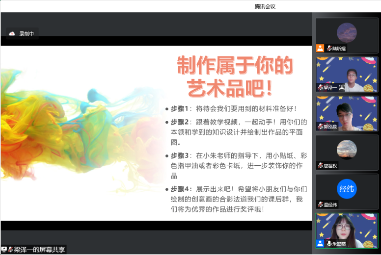 课堂通过腾讯会议线上进行,以高校艺术学院专业师资团队为主导,结合高校艺术学院大学生暑期实践队队员,打开少儿审美意识的大门的同时配合“双减”政策,为中小幼提供高品质的艺术教育社会服务。