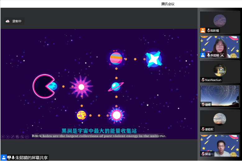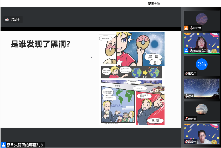 朱懿晴同学从可爱有趣的动画视频为开头,吸引孩子们聆听接下来的课程。进而运用几幅漫画,对小朋友们发出疑问,黑洞是谁发现的?黑洞的第一张照片是什么时候拍摄下来的?以生动活泼的讲解,进一步勾起小朋友们对黑洞的兴趣。