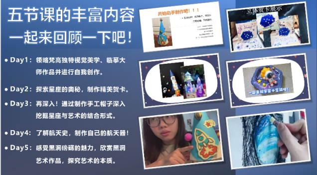 该创意美术夏令营活动以宇宙作为起始点,结合天文和美术进行课程教育,让孩子们将美妙,浩瀚,璀璨,神秘的宇宙银河系与实际生活中的想象,设计,与艺术创作联系起来。