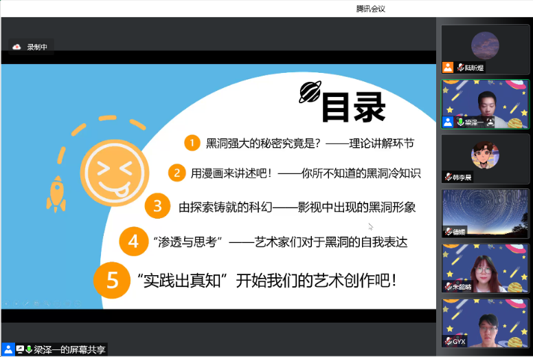 我们邀请到上海海事大学文理学院教师天体物理学博士孙祖尧老师为我们授课,主持人兼小老师梁泽一同学热烈欢迎各位小朋友和家长们参与此次“宇宙·黑洞·我们”课程学习,并简单介绍了课程的五个独特部分。