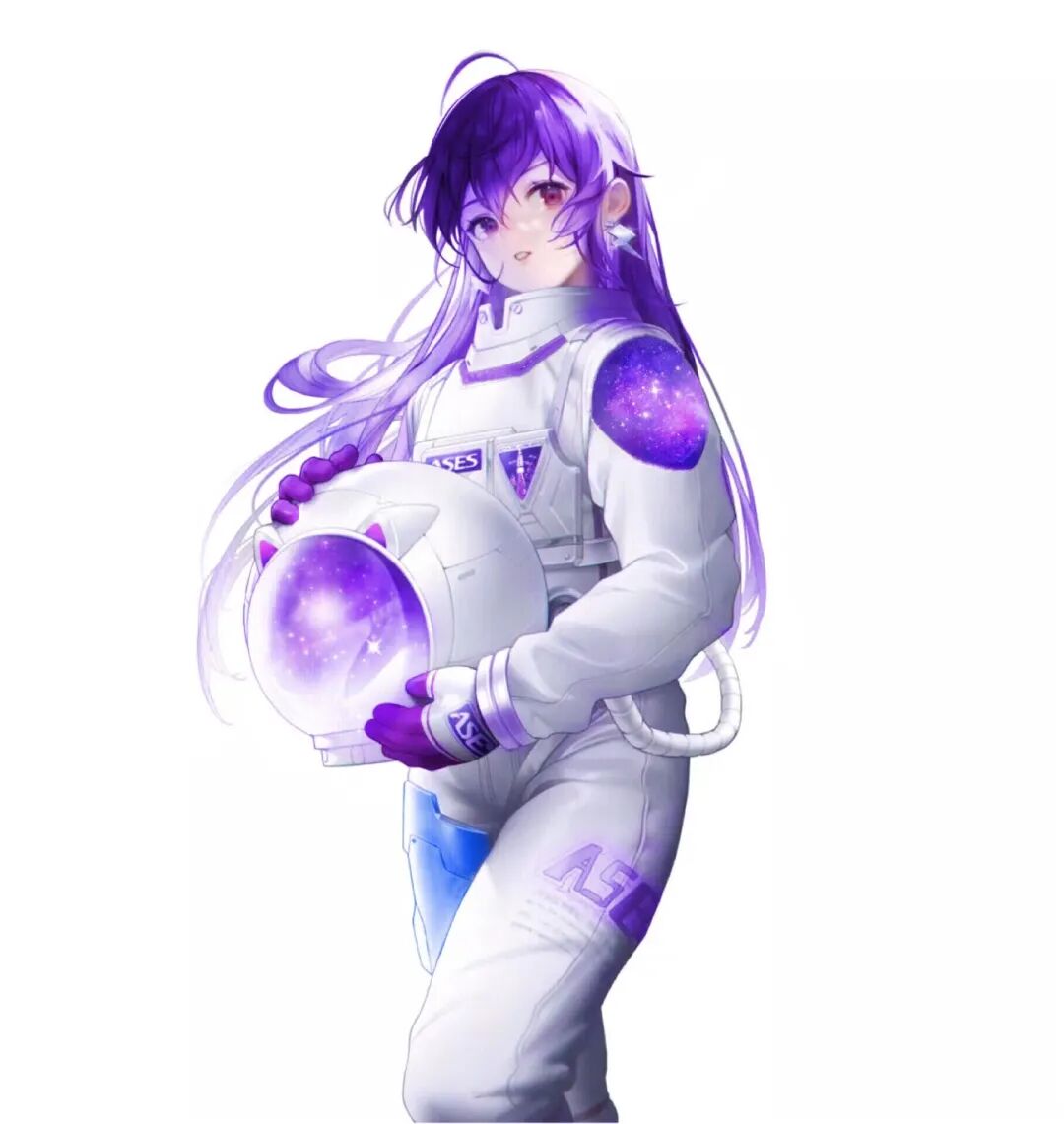 具有科技感的蓝色晕染,搭配着紫色的背景,十分温柔,像是在未来,在空间站的舒适房间里,小橘子摘下头盔休息的日常。