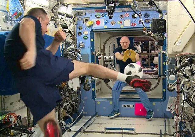 ▲俄罗斯宇航员在空间站内踢足球
