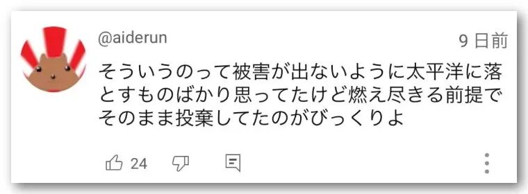 为了不出现这种受害情况,所以全都掉进太平洋,不过要以燃尽为前提。没想到竟然就那么丢弃,吃惊。