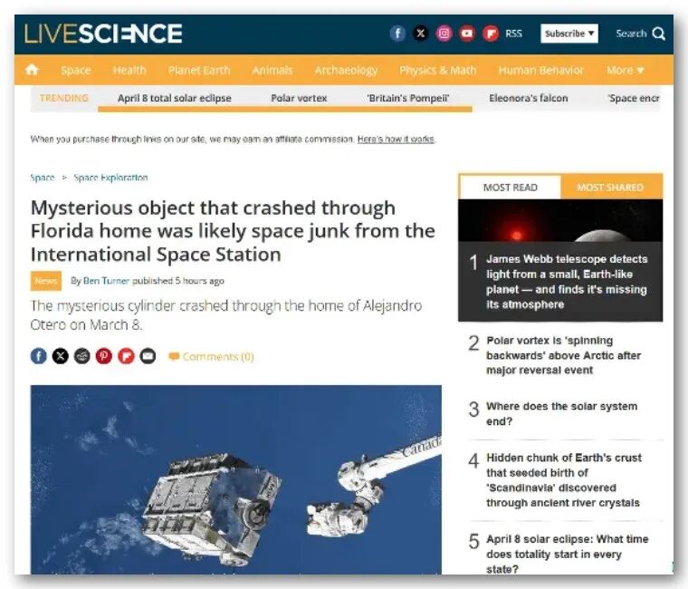 国际空间站丢出去的“垃圾”,砸穿美国民房,日本可能为此负责赔钱