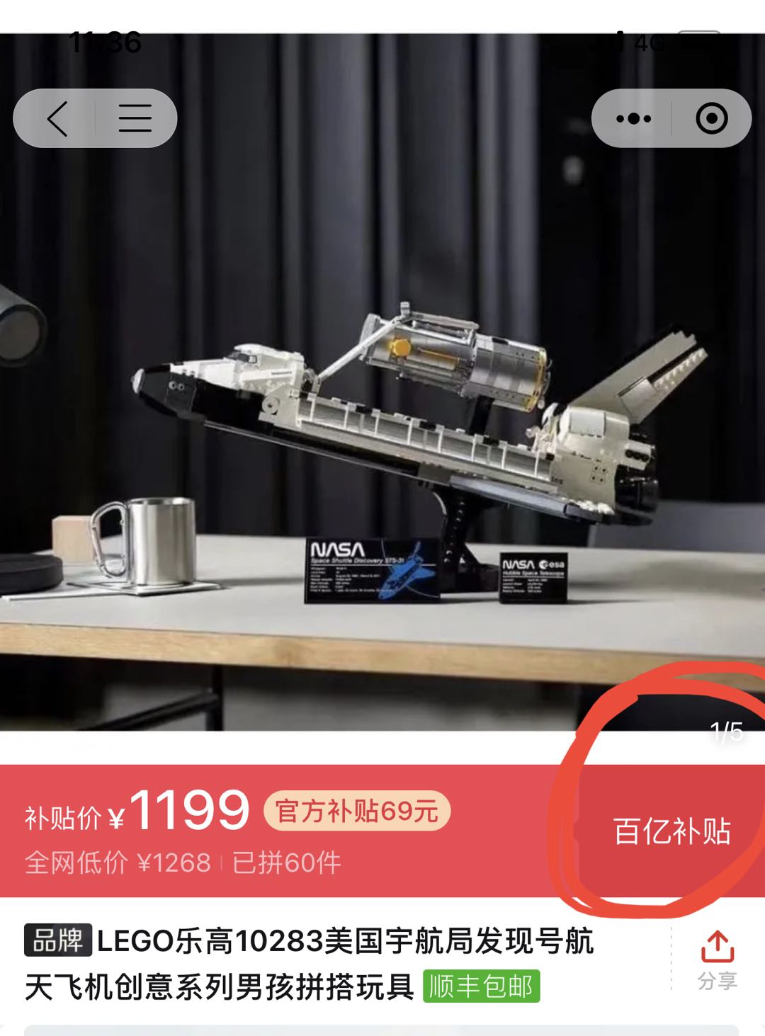 3月底发售的10283发现号航天飞机,今天终于看到拼多多百亿补贴上架了: