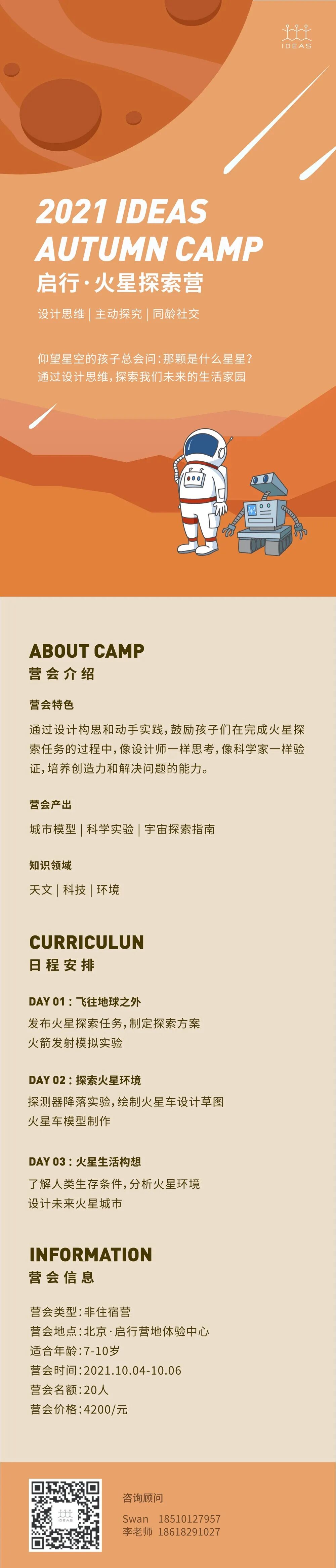 这个十一,启行开启专属未来一代的秋季「火星探索营」,带领孩子通过艺术与科学的方式了解火星、扮演小小星际工程师,一同探索火星的秘密,挑战最炫酷、最前沿的模拟太空旅行!