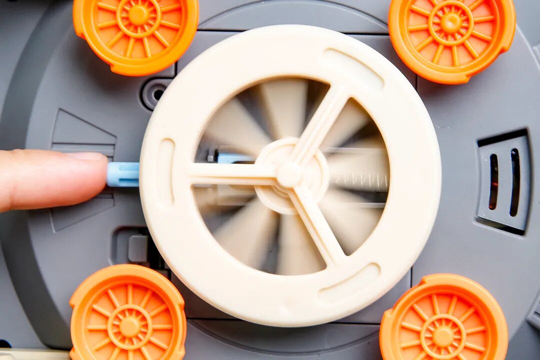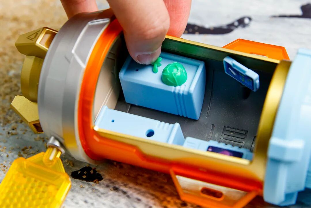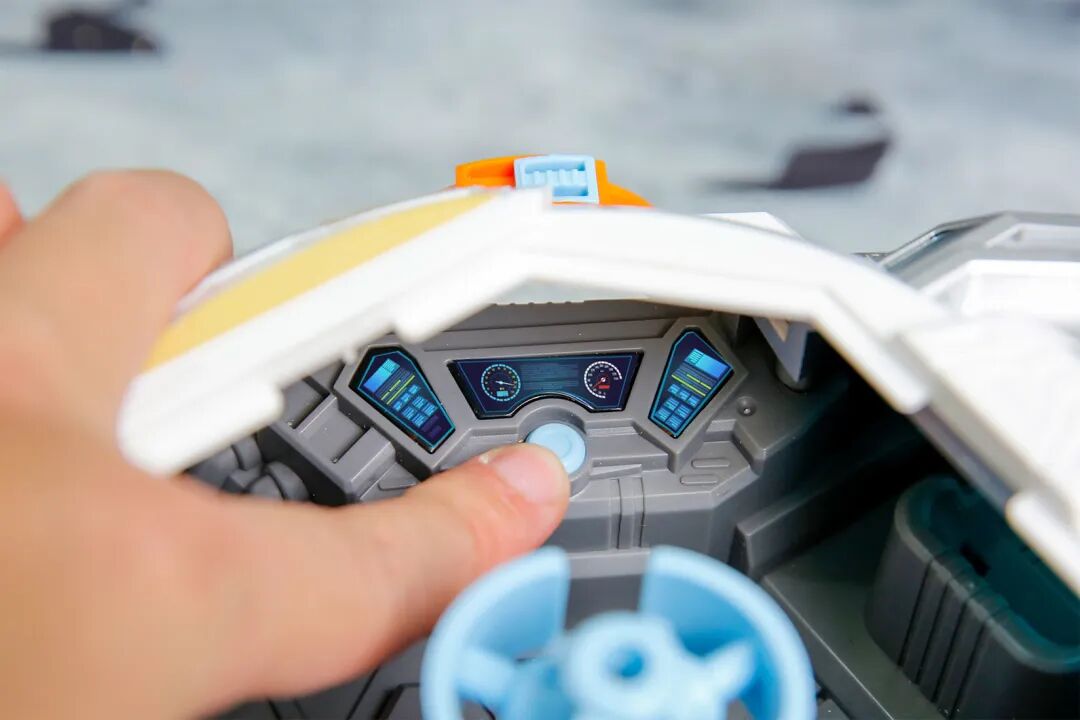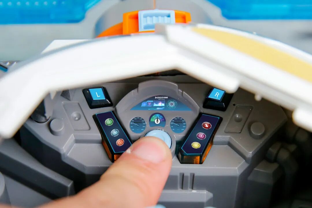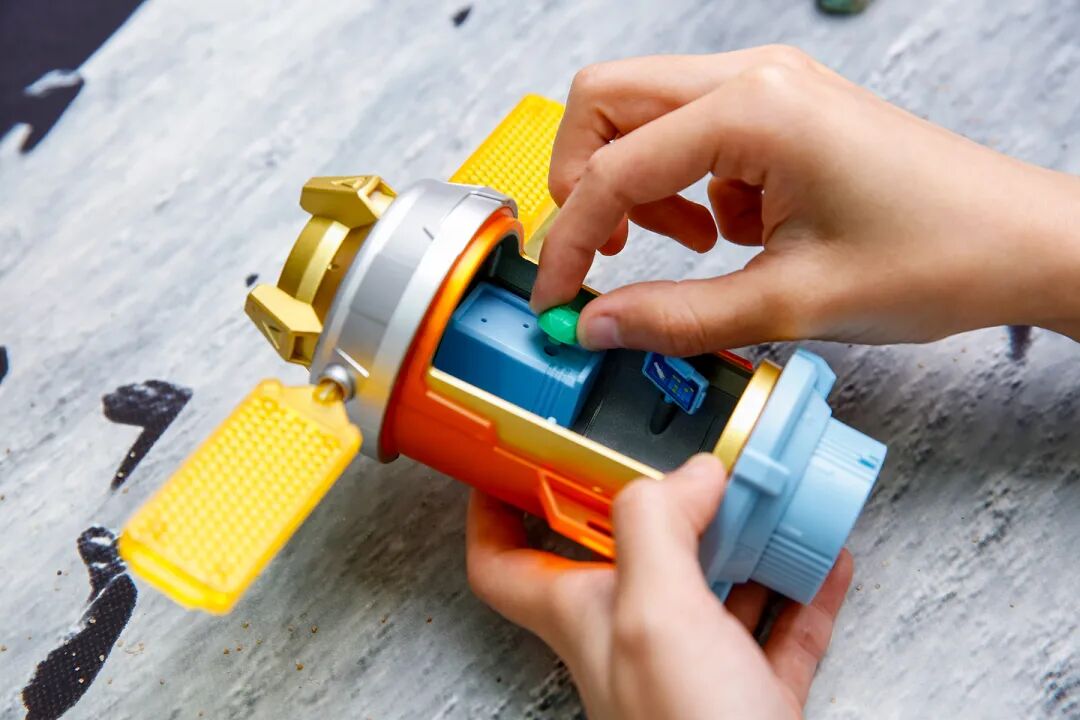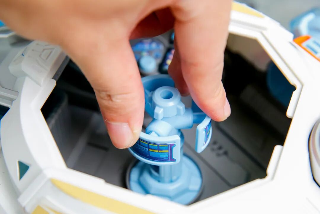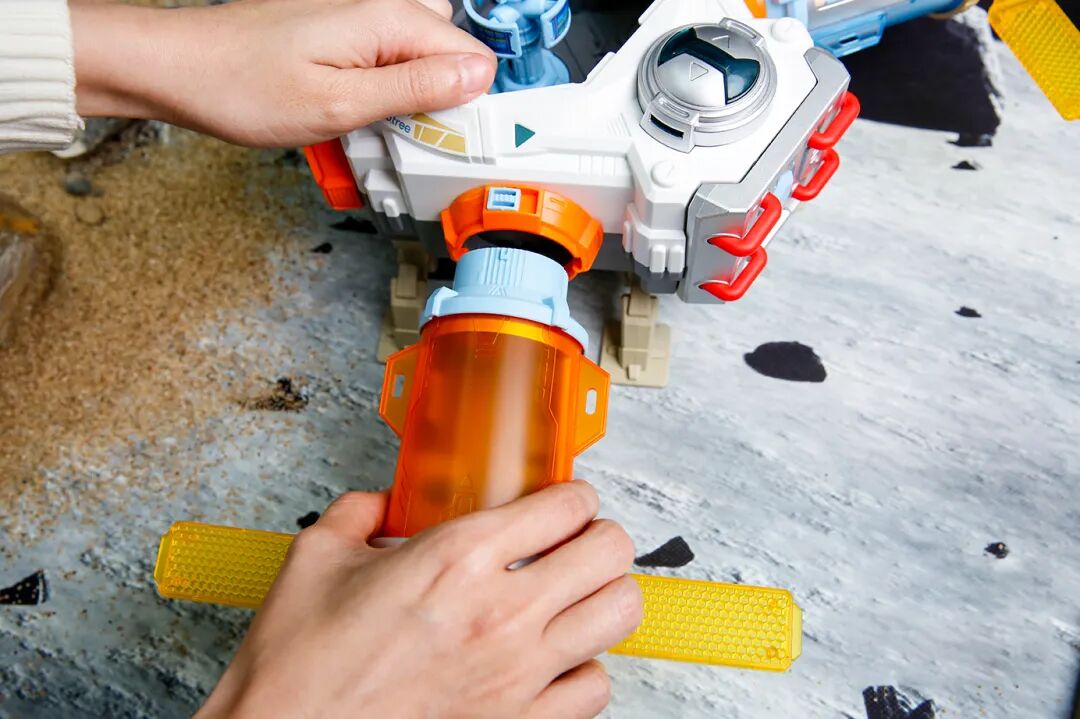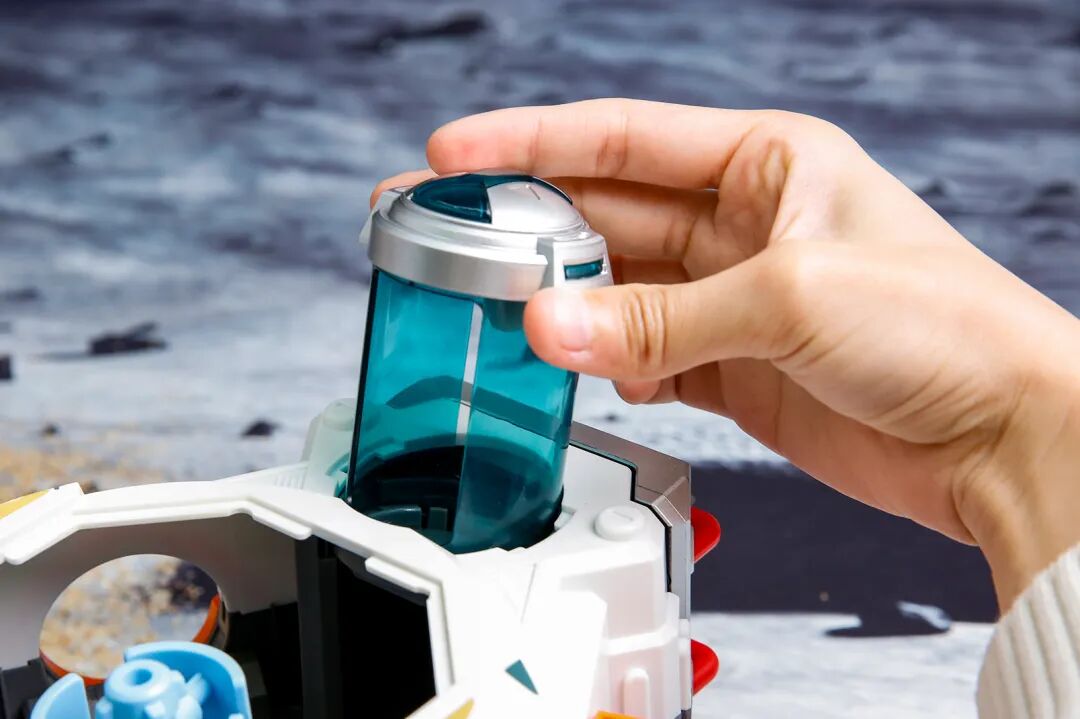 火星基地DIY拼装完成后,我们给它安装上3节5号电池,然后打开火星基地的上盖,旋转中心操作台,可以操控选择发出音乐、故事等音效功能,同时在中心操作台两边也各有一个小按钮,按下后会发出声光效果,舱体插入对应的孔位也有特定的音效,增添了可玩性和情景代入感。