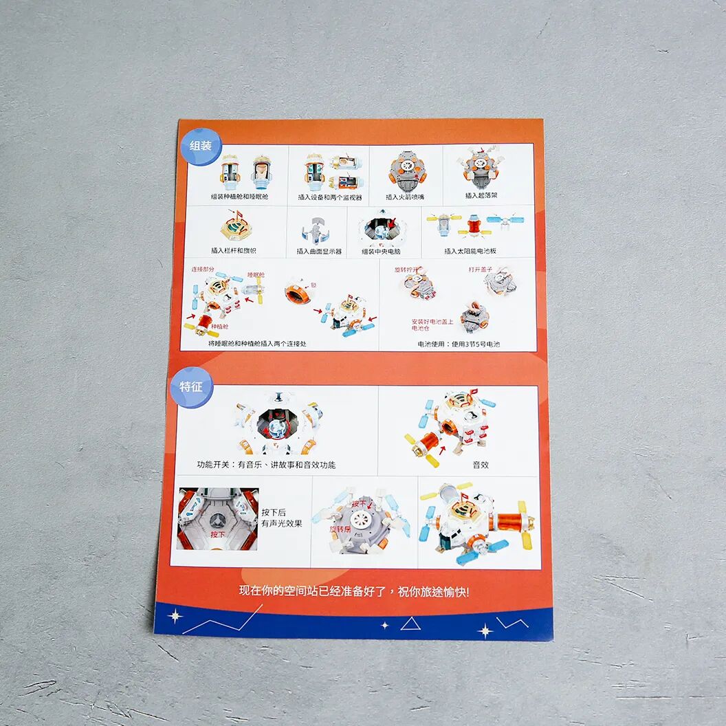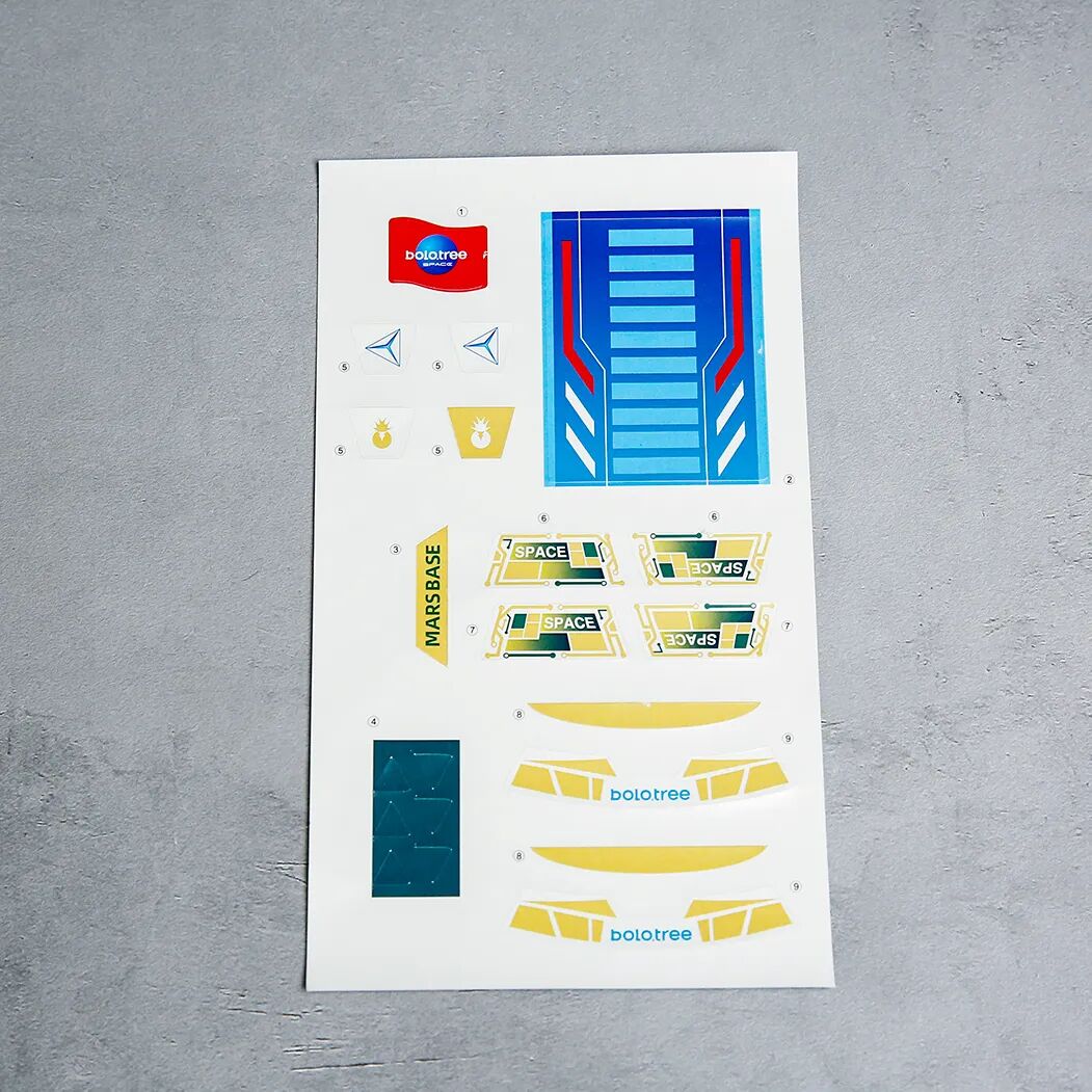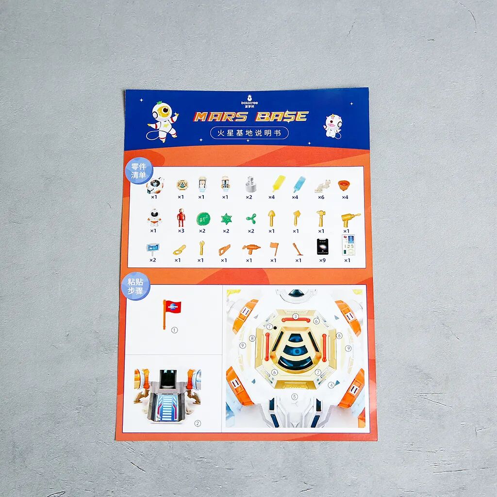 同时我们也配备了一张安装操作说明书和贴纸,小朋友可以根据说明书将火星基地零件DIY组装起来,然后用贴纸对产品进行DIY装饰。