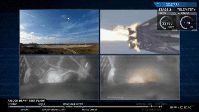 2018年2月6日,SpaceX成功发射了Falcon Heavy重型猎鹰,就是搭载着SpaceX宇航服假人(Starman)坐在特斯拉Roadster飞往火星那次,同时完成了2个助推火箭陆地回收,可惜的是芯级火箭二次反冲点火失败,最终落在了海上平台“We Still Love You”旁边的海里。实现全球首家私营公司将航天器(特斯拉Roadster轿车)送入日心轨道。