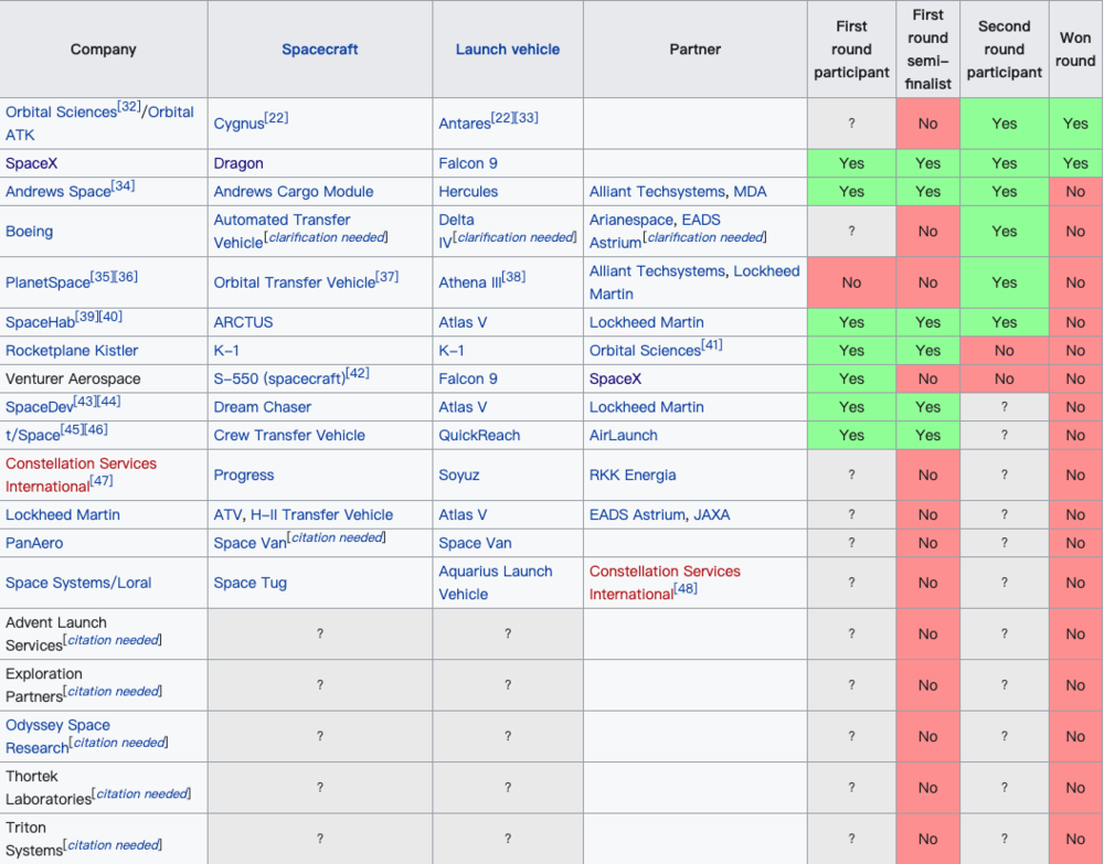2006年,NASA应政策倾向和寻找商业化合作出路,COTS(Commercial Orbital Transportation Services,商业轨道运输服务)应运而生,当时通过争取,有两家公司经过多轮考验最终入选:Orbital ATK和SpaceX,并且SpaceX因此获得2.78亿美元投资,后来于2011年追加投资至3.96亿美元,用于研发猎鹰9号和龙飞船(包括载人版)。
