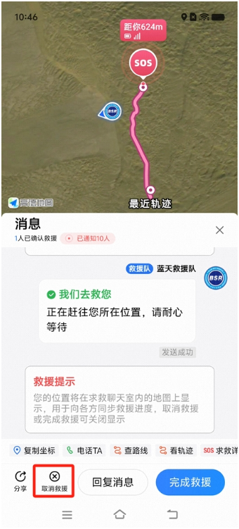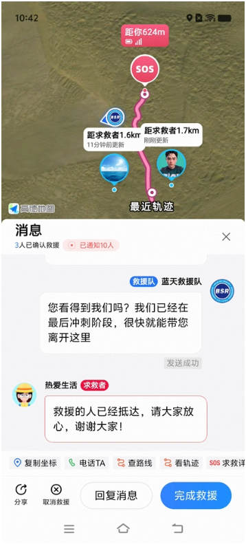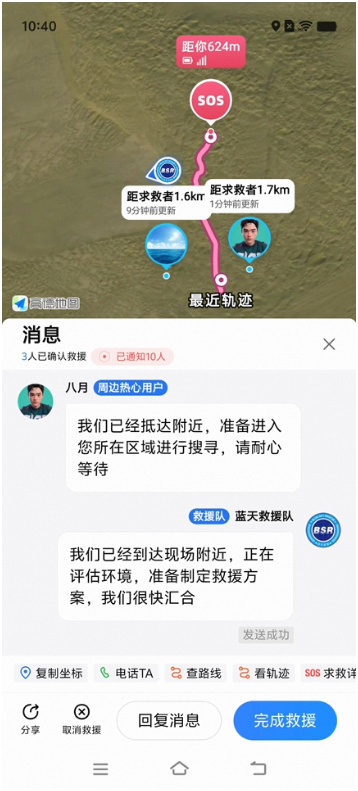 当您救援完成后,可在有网络区域,点击“完成救援”按钮,点击后需要等待求救者确认完成救援后,才会通知各方此次救援已完成。