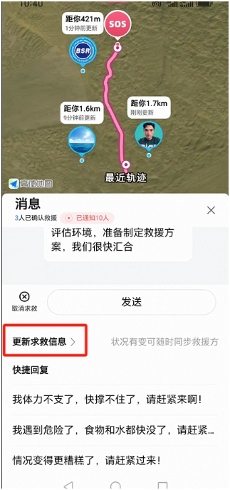如新增其他情况,可以点击发送按钮找到“更新求救信息”,进入求救设置界面重新选择状态发送。