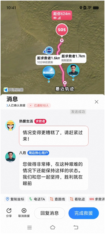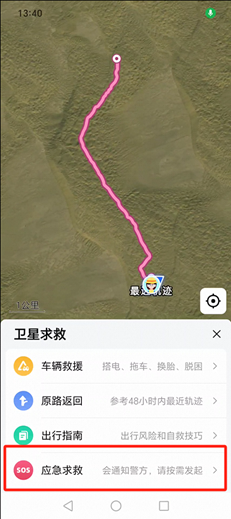 当您遇到无法自救的急迫危险时,可以使用应急求救功能,用蜂窝网络以及WLAN或卫星通信(需要手机支持卫星通信),向紧急联络人、附近的救援队、同行队友、热心用户发送求救信息和位置轨迹,并进行实时沟通。不过,需要提醒的是,“应急求救”功能只有在高德识别的无路网区域范围内才能发起,且需要高德地图升级到1500版本及以上。