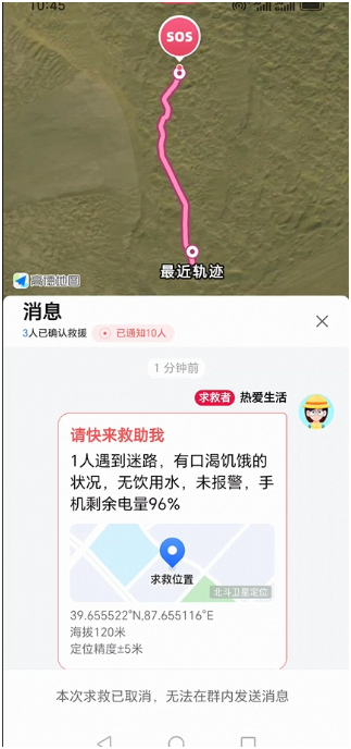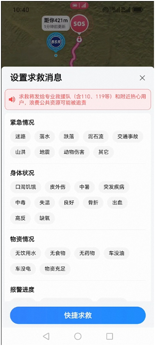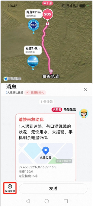 注意:求救将发给专业救援队(含110、119等)和附近热心用户,浪费公共资源可能被追责,所以应急求救只能在无路网区域内发起(地图上红色区域)。