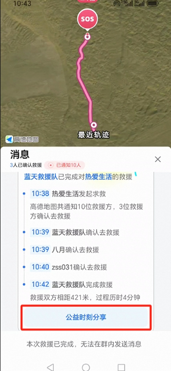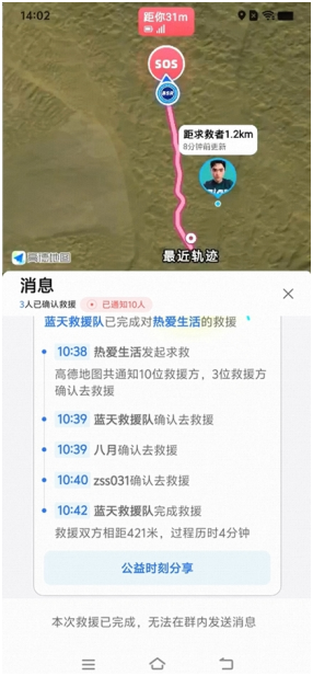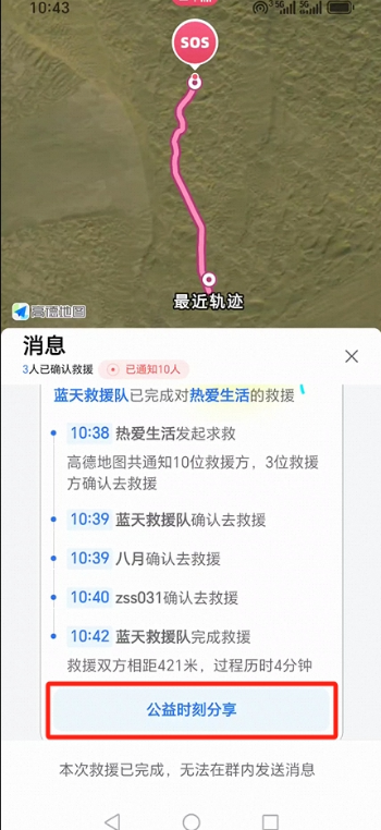 当求救者与救援者共同确认救援任务圆满完成时,系统将自动展示本次救援任务的总结。轻触'公益时刻分享'按钮,您即可将这份救援故事传播至各大平台。让社会各界了解这些默默奉献、不求回报的善良救援者,向他们致以最崇高的敬意。