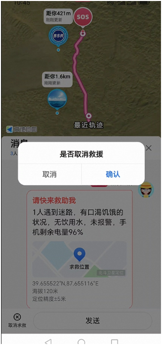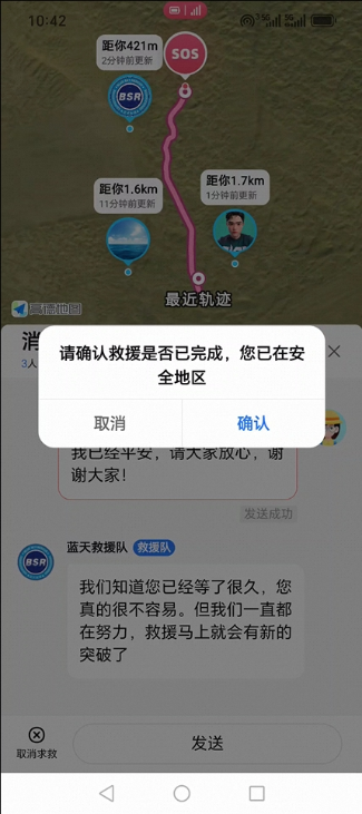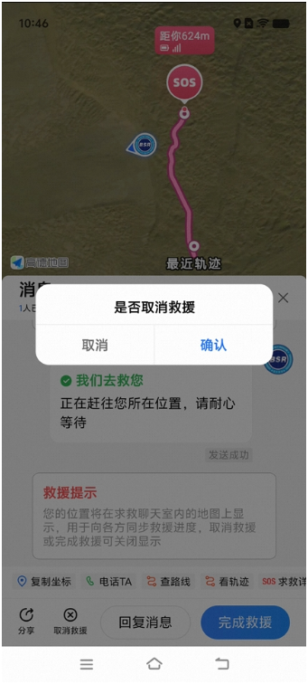 如果您不小心误操作,或者已经脱离险境可以自救,可以点击左下角取消求救,以节省公共资源,点击确认后,就会取消救援并自动退出求救聊天室。