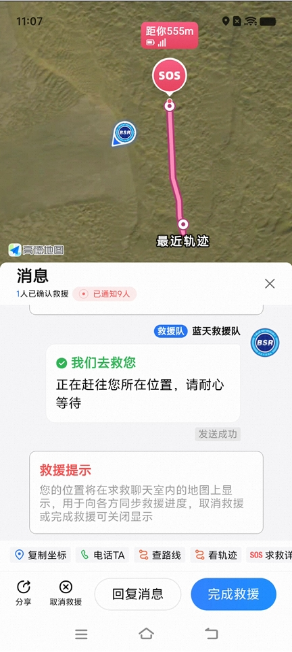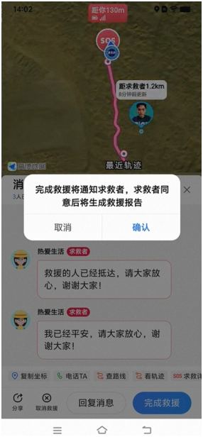 注意:完成救援功能只有求救者和救援方都是高德地图1506及以上版本可以使用,低版本用户无法收到完成救援请求或者进行操作。