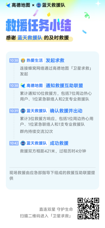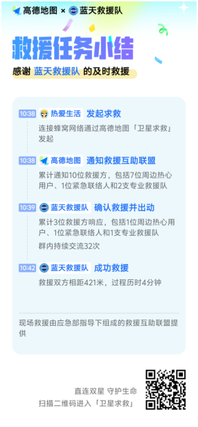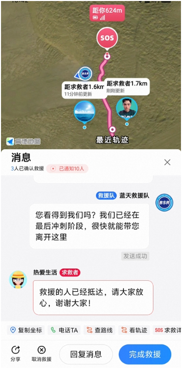 在应急部国家安研院、中国安全生产科学研究院指导下,高德地图联合蓝天救援队、曙光救援同盟、绿舟救援队、中国汽车工业协会越野车分会等机构,共同成立国内首个基于地图平台的“救援互助联盟”,小德的卫星求救功能自2024年8月30日上线以来,已经救助了32人,这些人分布在北京、西藏、辽宁、云南等8个省市。