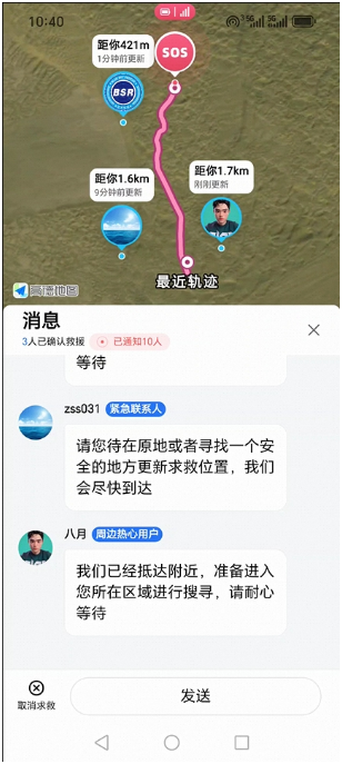 求救信息会以电话、短信、站内消息等方式发送给附近救援队、热心用户和紧急联系人。