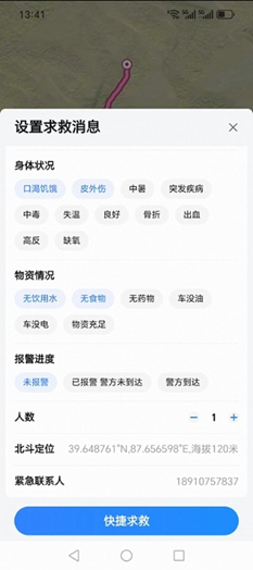根据提示将自身紧急情况、身体状况、健康状况、物资情况和报警进度及人数如实填写,系统会自动生成当前定位。确认发起求救后自动发送含有所有信息及轨迹的求救信息卡到聊天室,并且会显示手机当前信号强度及剩余电量方便及时调整手机确保联系。