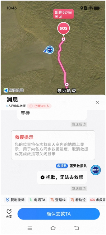 通过下方小功能按钮可以进行复制坐标、电话联系求救人、查询路线、查看求救人轨迹等操作,综合研判求救人情况,方便判别是否参与救援,优化救援资源配置提高救援效率。