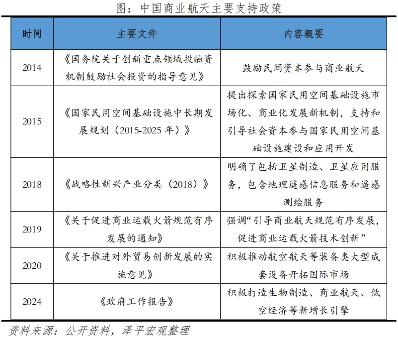 3 从航天局支持、私营独立发展、迈向商业化引领新阶段3.1 欧美商业航天发展历程欧美的商业航天起步离不开本国航天局的支持。航天事业的商业化可追溯到20世纪60年代。1961年4月,国际通信卫星组织利用美国国防承包商洛克希德·马丁的运载火箭将首颗商业卫星送入太空。1980年3月,法国阿里安空间(Ariane)公司诞生,这是世界上第一家提供商业航天发射服务的公司,其背后是法国国家空间研究中心和欧洲航天局(ESA)。2000年“蓝色起源”Blue Origin成立,2002年SpaceX成立,两者的目标都是减少太空运输成本,且都与美国国家航天局(NASA)有合作关系。2008年,SpaceX成功发射猎鹰1号火箭,成为首个具备发射液体燃料火箭至地球轨道的私营企业,标志着私营独立发展的开始。2012年,SpaceX的龙飞船首次成功向国际空间站(ISS)运送补给,这是首次由私营企业运营的航天器执行此类任务。2015年,SpaceX实现了猎鹰9号火箭的首次海上回收,私营火箭企业开启了火箭发射的可重复使用时代。2016年2月,英国“维珍银河”公司正式发布未来用于太空旅行的新版太空船,太空旅行概念正式进入商业航天领域。2023年8月,“维珍银河”的VSS Unity太空飞机从美国新墨西哥州发射后抵达太空,商业航天公司首次将乘客送往太空。2024年10月,SpaceX实现星舰(Starship)的第一级“超级重型”助推器回收,该技术突破树立了开启低成本太空任务时代的里程碑式,标志着私营火箭的技术发展已经领先国家航天项目,商业航天开始主导太空项目研发方向。3.2 中国商业航天发展历程中国的航天发射活动主要由国家主导,通过国家航天局和中国航天科技集团等机构进行。主要发射任务包括:载人航天(神舟系列飞船)、科学探测(嫦娥探月工程)、北斗导航卫星系统、遥感和通信卫星(用于地球观测、资源勘探、气象预报以及通信)、技术试验卫星(新技术、新材料、新设备的在轨试验)、以及为国内外客户提供商业发射服务。2015年,在国家主导航天工业发展60多年后,中国首次向民营资本开放航天领域;“北京二号”成为首个经政府批准的民用商业卫星项目,中国商业航天正式起步。2018年5月,“重庆两江之星”成功发射,是中国首枚民营自研商用亚轨道火箭。同年,“双曲线一号”火箭首飞成功,证明了中国在商业火箭领域的自主研发能力。2023年中国共进行67次航天发射,位列世界第二,其中商业发射26次,成功率达96%。2025年将开启中国商业航天独立发展到引领行业的阶段,形成强势追赶。2024年,商业航天首次写入《政府工作报告》;9月11日,蓝箭航天研发的朱雀三号完成10公里级垂直起降返回飞行试验,我国商业航天在可重复使用运载火箭技术上迈出重要一步。