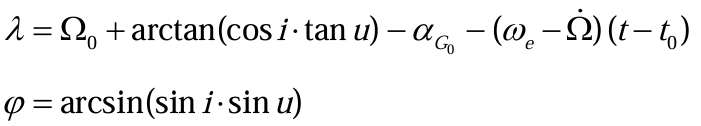 其中,u为纬度幅角,u=ω+f,ωe为地球自转角速度,αG0为起始时刻的格林尼治恒星时。