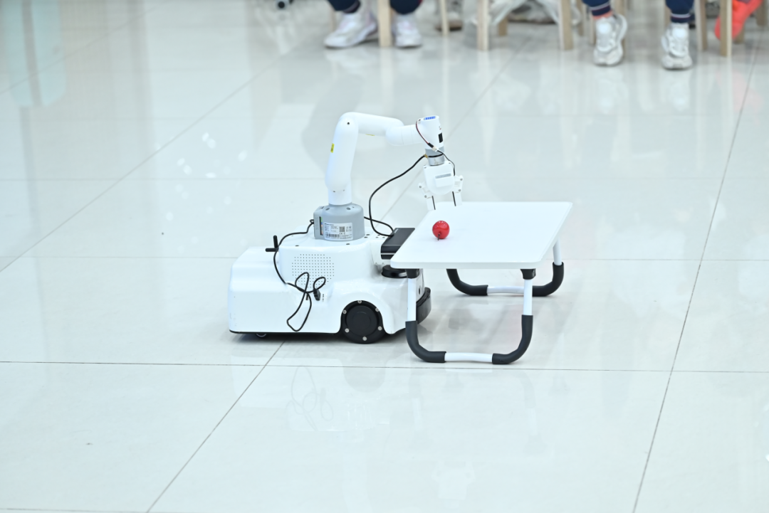 终于,最激动人心的机器人互动体验环节到啦。小李老师邀请孩子们依次上场操控机器人。刘宸煜同学一马当先,在老师的细心指导下迅速掌握了机器人的操作技巧,胆大心细,成功完成了苹果采摘任务,赢得了同学们阵阵掌声!