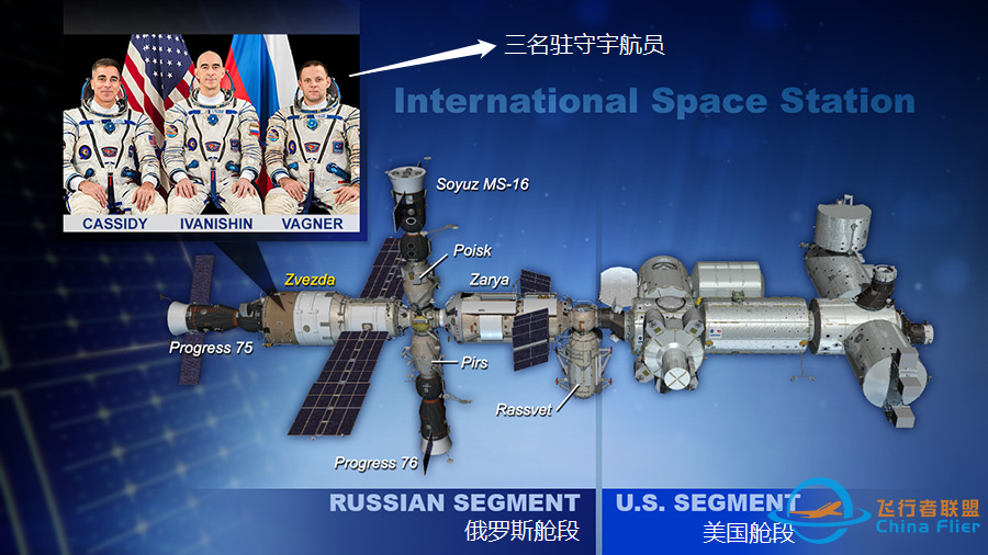 据了解,俄罗斯“联盟MS-16”飞船今年4月顺利升空入轨,把2名俄宇航员、1名美国宇航员送抵国际空间站,执行驻站任务。三人分别是俄宇航员阿纳托利·伊万尼申、伊万·瓦格纳和美宇航员克里斯托弗·卡西迪。他们将在国际空间站驻守196天。