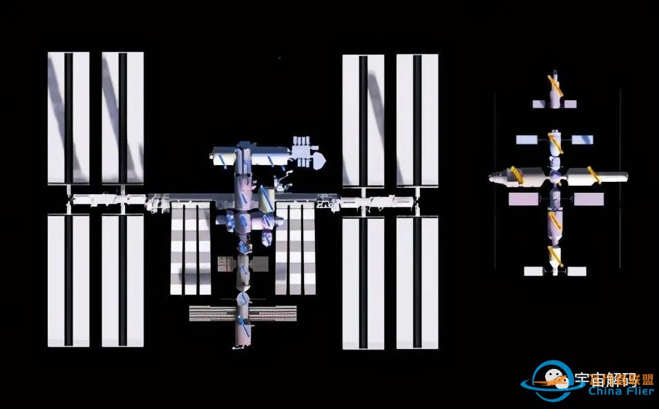 如果我们把国际空间站和中国空间站的太阳能电池板都去掉,就会发现国际空间站并没有比中国空间站大到哪儿去,如下图所示: