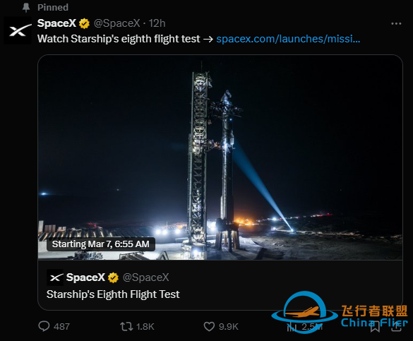 今日,SpaceX 放出了明天早上 7 点半星舰第 8 次试飞预告。